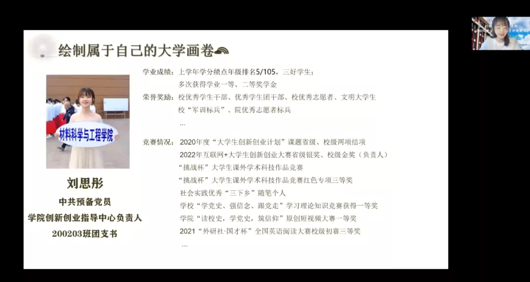 材院网讯(通讯员:冷鹏飞)2022年9月8日8:30,yl6809永利官网集团于线上召开“2022级新生教育系列活动”之十佳大学生经验分享会暨新老生交流会。本次大会由校十佳大学生刘星宇、陈洋,老生代表刘思彤共三位优秀学生主持,各位代表主要从学习经历,工作经验,参加相关竞赛等相关内容展开叙述,全体22级新生参加此次会议。