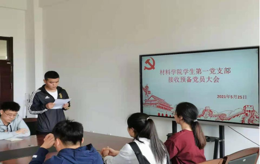 2021年5月25日yl6809永利官网集团学生第一党支部于材料楼425会议室召开预备党员接收大会。本次大会由支部书记李爽主持,支部全体党员参会,参会人员共34人。
