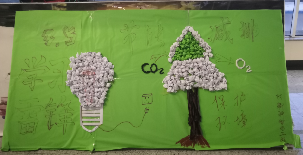 我们以板报的方式,向同学们宣传节能减排,保护环境。我们利用学院废弃的纸,回收再利用,发挥创意,制作了一个灯泡和一棵树,灯泡象征着我们平时使用的电器设备,断开的电源是在提醒同学们出门断电,既保证了安全,又节约用电。树象征着自然环境,树木能够净化空气释放氧气,而氧气是我们人类赖以生存的条件,所以呼吁大家要保护环境,从我做起,从每一个人做起。