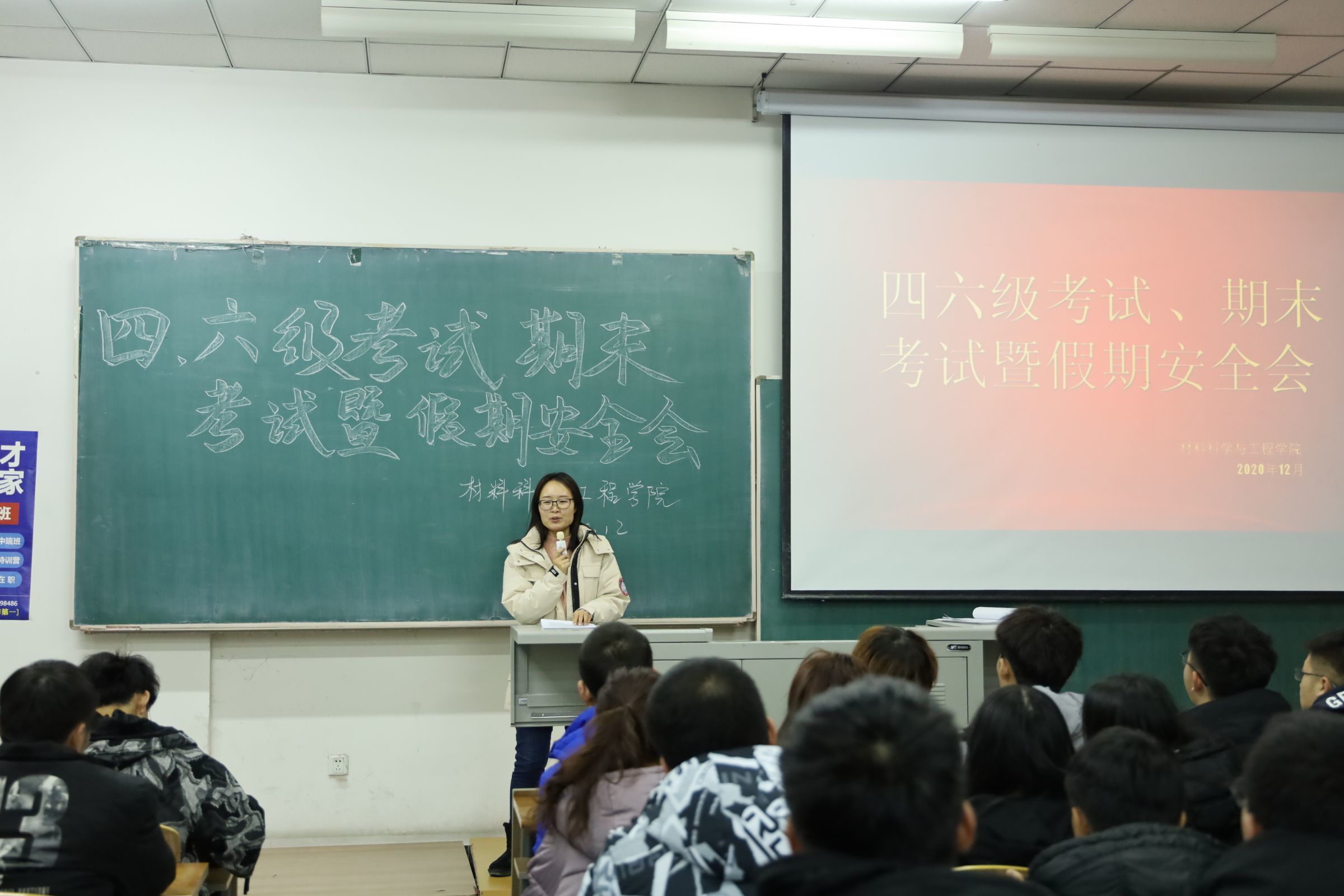 材料网讯(通讯员 宋彤)2020年12月10日下午5点50分,yl6809永利官网集团在北湖校区主楼1201教室,召开四六级考试期末考试暨假期安全会。19级辅导员李爽老师及2019级全体同学参加了会议。
