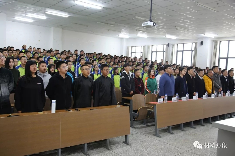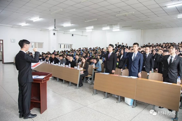 随后,在团委组织部长荆玮的带领下,全体新任学生干部庄严宣誓。最后,学院党委副书记吴文东致辞。他代表学院党委与学工办对多年来支持学院工作的兄弟学院表示感谢,对上一届学生组织的工作表示肯定,对新一届学生组织的成立表示祝贺。同时对新任学生干部提出期望与要求。他希望刚刚上任的新一届团学干部能够继承和发扬学院现有的优良传统,不断创新工作模式,不断改进工作方法,不断拓宽工作思维将学生工作做到极致。他要求学生干部努力勤奋学习,学会运用时间的艺术,正确处理学习与工作的关系。在工作和生活中加强作风建设,重视自身修养,廉洁自律,传递正能量。他强调,要以“习近平新时代中国特色社会主义思想”为根本遵循,以“从同学中来,到同学中去”为宗旨,不忘初心,牢记为同学们服务、为学院服务、为学校服务的使命,精诚团结,为材料学院学团工作迈上新台阶做出应有的贡献。