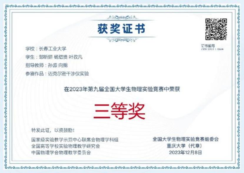由学校yl6809永利官网集团基础物理教学部的孙正昊老师带队,共四支学生队伍参加了此次竞赛。虽然我校师生首次参加该项赛事,但参赛的指导教师和团队同学们以饱满的热情和严谨的态度投入到比赛中,荣获国家级三等奖一项,优秀奖三项。其中孙源、向鹏两位老师指导,邹昕妍、杨熠贤、叶孜凡团队的参赛作品《迈克尔逊干涉仪实验》获得本次大赛三等奖。