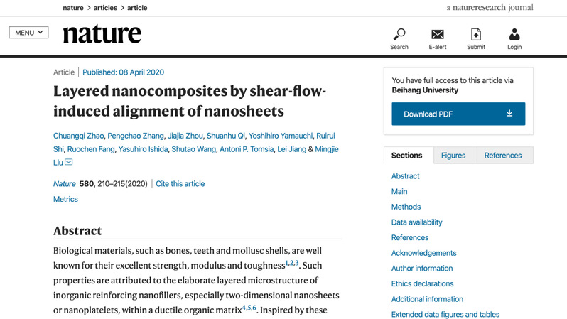 4月8日,Nature杂志以在线全文Article的形式发表了我院2012届毕业生赵创奇参与的研究成果:在超强材料方面的最新研究成果“Layered nanocomposites by shear-flow-induced alignment of nanosheets”。
