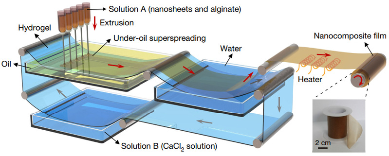 为解决上述难题,赵创奇所在的北京航空航天大学化学学院刘明杰教授课题组提出了基于极稀反应溶液的液体超铺展制备策略。该研究发展了一种基于液体超铺展制备层状结构复合膜制备的新方法,解决了层状结构复合材料无法大面积连续制备的难题。并提出了无机纳米限域空间内高分子链的运动受限是导致复合材料超高力学性能的科学机理。该工作为仿生材料的结构设计及大规模生产提供了新的解决途径。