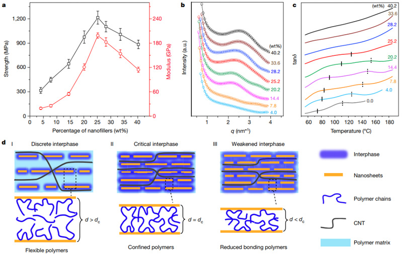 纳米复合材料的力学性能取决于纳米片的取向结构及其与基底高分子之间的相互作用。为了揭示层状纳米复合膜超高力学性能的内在原因,作者系统研究了纳米材料填充量对纳米复合膜力学性能的影响。实验结果表明,纳米片的填充量对其取向结构无影响(均具有优异的取向结构),然而对其力学性能的影响却截然不同(图5a)。小角X射线(SAXS)结果表明其纳米片层间距差异显著(图5b)。纳米复合膜的玻璃化转变温度随着纳米片含量的升高而升高(图5c)。基于此,作者认为层间距是影响纳米片与高分子基底之间相互作用和纳米复合膜力学性能的直接原因,而纳米限域空间内高分子链的运动受限是其超高力学性能的根本原因。随着纳米片填充量的逐渐增大,纳米片层间距逐渐减小,层间高分子链段的运动受限越来越强。当纳米片层间距减小到约2.6 nm的临近状态时,对应层间的高分子受限运动达到最大,而此时层间高分子与纳米片之间的相互作用位点达到最大,这就是层状结构纳米复合材料表现出优异力学性能的科学本质。