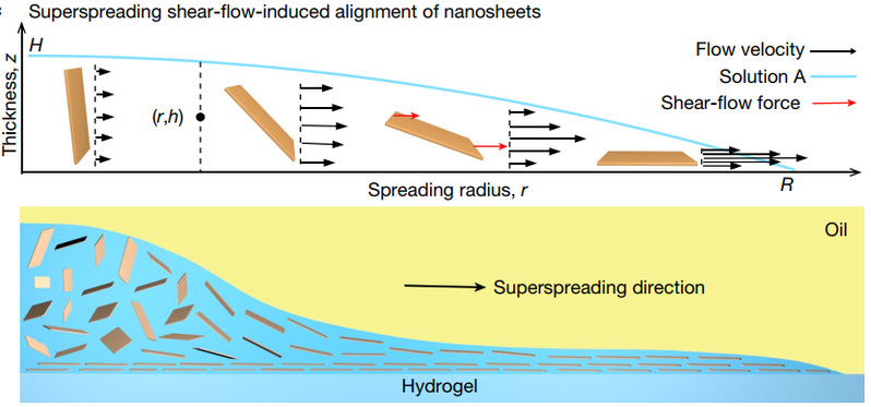 该新型的制备策略不仅利用反应溶液在超铺展过程中产生的剪切液流实现纳米片的高度取向排列(图1),而且利用高分子快速交联,同步实现取向结构的原位快速固定(图2),从而制备出层状结构纳米复合膜。通过优化设计超铺展溶液中高分子和纳米材料的组成,制备出具有超高力学性能的纳米复合膜:基于氧化石墨烯/粘土纳米片的层状复合膜的拉伸强度高达1215± 80 MPa,杨氏模量高达198.8± 6.5 GPa;基于粘土纳米片层状复合膜展现了超高韧性:其断裂韧性高达36.7± 3.0 MJ/m3,同时其拉伸强度高达1195± 60 MPa。